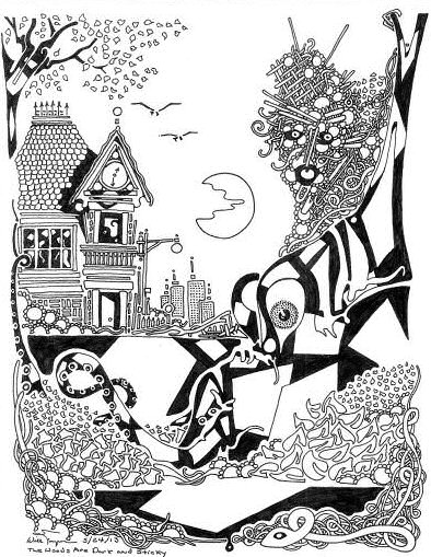 echoed with a thousand stealthy footsteps. A light rain began to fall. Julio smiled, pulling a club soda out of the cooler. “Guys getting the jump on me, huh? Well, I’m here now. You can start sending your money in this direction.” Arthur shook his head, pointing at Julio’s beverage. “This is what I’m talking about. The kid should have to drink. We’re playing cards and drinking. Of course, he ends up with most of the money, drinking water all night. He should have to take a drink.” Walt laughed and dealt. “Ante up, Jules. Not even I get to play based on my good looks alone.” Julio reached for his wallet, and froze. Oh my fuck. It all came back to him. Wrenching his pants up in the bushes, he’d felt something brush his ankle. The wallet flipping out of his back pocket. He jumped up from the table. “Forgot my wallet.” “Hurry back.” Julio had his hand on the doorknob when Walt asked, “How’s your arm?” Slowly, he turned back. “How’s that?” “Rick said you got hung up on a rose bush. I was tinkering with the water pump a couple of hours ago, and there’s a pretty good spray of blood on the pump house wall. If Rick hadn’t mentioned your accident, I would’ve thought cats had been back there, fighting.” Julio rubbed his bandaged forearm, mind racing for excuses, and explanations. Why would I have been back in those bushes, did Rick already give him the screwdriver story. And come to think of it, why the fuck would Walt have been stumbling around the pumphouse? “I could have done taken care of that, Walt, the water pump. Did you fix it?” Julio cringed inwardly; that didn’t sound like anything he would actually say. Walt smiled, and after what seemed like an unnaturally long pause, said “So, your wallet, then?” “I’ll be right back.” Julio waited until he was out of sight to break into a sprint, dodging stones, skidding on the wet grass. If Ricky was poking around in those bushes, and noticed the wallet, that fucker’s long gone. He won’t even have the decency to take the eighty bucks and leave my ID and the pictures of my sister’s baby. Julio could see the weak flickering light on the pump house, and he picked up the pace, mentally running through all the ways that losing the wallet was going to be a huge pain in the ass. Cancelling the credit card, the debit card, setting up new account numbers. Shit. What if Ricky had already drained his bank account, charged a new jetski and AK-47? Sprinting around the corner of the pump house, Julio stopped short, skidding on the gravel path. All thoughts of his wallet and Ricky and the card game instantly evaporated. What the hell. The ground had been ripped up, chunks of sod dislodged, water pooling in the muddy ruts and craters. Those fucking kids spinning cookies in their pickup. He thought back to the sixteen-hour day he’d spent repairing the damage those little pricks had done last spring. Noticing that in addition to ripping up the grass, they’d knocked the senator’s stone askew, shattering the clay statue of a cougar, Julio saw red. This time, I’ll be doing a whole lot more than calling the cops. No sooner had Julio begun imagining what he’d do to their truck, and to the kids themselves, than he saw the body. Just past the pump house, right in the middle of the gravel path was a man, lying facedown in the dirt. His long white hair fanned into the mud. “Sir,” Julio came hesitantly closer. What the hell had happened here? The same kids ripping up the grass had rolled a bum, or what? “Can you hear me?” Julio knelt, gently shaking the man’s shoulder. Not a bum, though. At first I’d only noticed the crazy hair. But no bum’s wearing leather shoes, or gold cufflinks on his Armani suit. Brown Armani— Julio’s stomach lurched, and he jumped up, stepping back. Just like the suit that the senator had worn, down into the ground. He looked at his surroundings more closely. The sod hadn’t been ripped by tires, it had been blown straight up. Like a bomb had gone off underground. Or like someone had dug up out of— The hand sprung forward, grabbing his ankle, twisting Julio to the ground. Oh fucking god what. He sprung up, sprinting down the gravel path, whining and grunting with adrenalin. Cutting towards the main gates, But I’m not gonna go to Walt’s, even though I can see the lights in the living room, instead I’m gonna go all the way down the fucking mountain, into town, because, because. Julio’s feet slid on the wet grass, kicking out from under him, and he went down, banging the side of his head off a stone. Struggling to push himself up, he heard wet footsteps behind him, and turned to look back at his pursuer. But there was nothing. Through the drizzle and the mist, Julio saw, in the weak light thrown by the lamp on the pumphouse, the body still sprawled in the path, just as he’d found it. Pushing himself up off the ground, he waited as his brain cooled and his breathing slowed. Calm down, get ahold of yourself. No monster movie bullshit. So the senator’s grave had been desecrated, probably robbed. Although during Julio’s tenure he’d never seen a body dug up and laid out like that, he’d dealt with grave robbing before. He sighed, thinking about the unpleasant night of work that had just come to replace the Friday night card game. Off in the distance, through the fog, Julio heard his name. Two figures loomed up out of the misty rain, Walt’s familiar voice repeating “Julio?” The two old men materialized through the burgeoning rain. “We thought maybe you’d fallen into an open grave out here, ha ha. What—” As they drew close enough to see him, the smile fell from Walt’s face. Concerned, he asked, “What‘s going on?” Julio sighed. The senator had been Walt’s friend? Whatever the connection, Walter didn’t need to be subjected to seeing the body. Maybe Julio could convince the old man to lay back, while he took care of the im